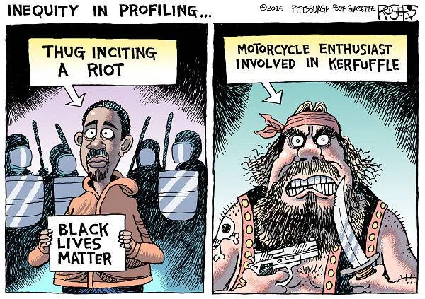 Corporate media coverage of recent events most certainly fits this pattern. When ongoing state terrorism sparked the #BaltimoreUprising last month, mainstream news outlets roundly condemned the protesters (mostly Black) as thugs, as criminals and the like. Though in the aftermath of the #WacoShooting earlier this week, such language from the media has been absent. A double-standard is also reflected in the actions and verbiage of law enforcement. White "bikers" congregate freely after their "brawl" - even allowed to use their cell phones - while Black "rioters" are met with tears gas.